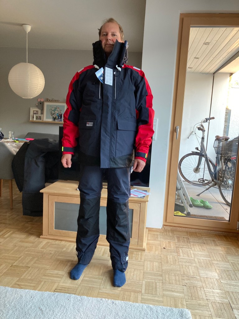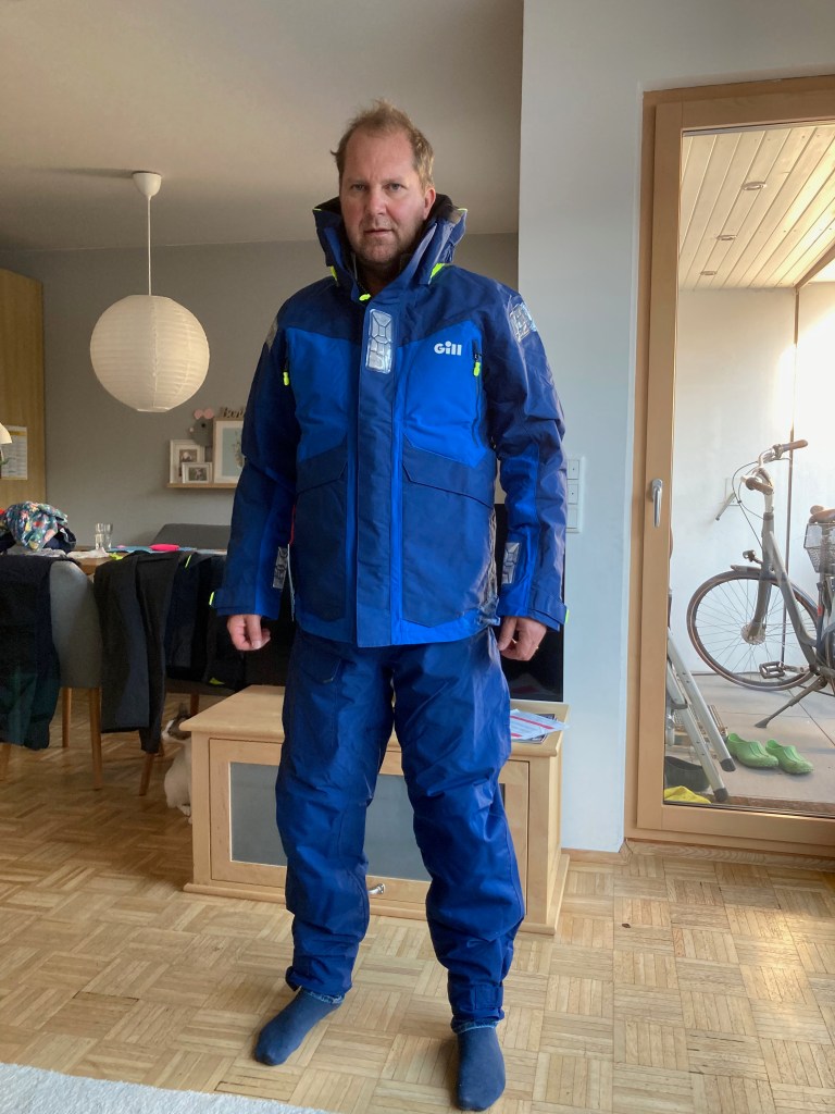 Ich hatte die Wetterkleidung nach den Gesichtspunkten Preis, Dichtigkeit, Atmungsaktivität – und ja, auch Farbe, ausgewählt. Der konservative Seemann steht nun mal mehr auf marineblau als auf die Trendfarben rot und anthrazit. Das bedeutete auch: Premium-Marken wie Musto blieben aus Budgetgründen leider in den Lagerregalen.
