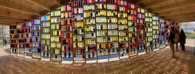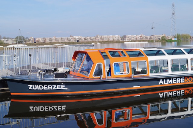 Angereist sind wir mit dem Boot: Der Jachthafen Muiderzand bietet reichlich Gastliegeplätze. Von dort bis zum Bahnhof Almere-Poort sind es etwa 15 Minuten zu Fuß durch den neu gebauten Stadtteil am Markermeer. Richtung Almere Centrum verkehren mehrfach pro Stunde Züge, die nötigen zwei Stationen sind in weniger als zehn Minuten absolviert. Ab Almere Centrum ist die Floriade ausgeschildert. Wir sind natürlich per Barkasse zur Ausstellung übergesetzt. Das kostet ein wenig extra, ist aber genau der richtige Einstieg und wir haben vom Käpt’n noch einiges über die Entstehung und Architektur von Almere erfahren.